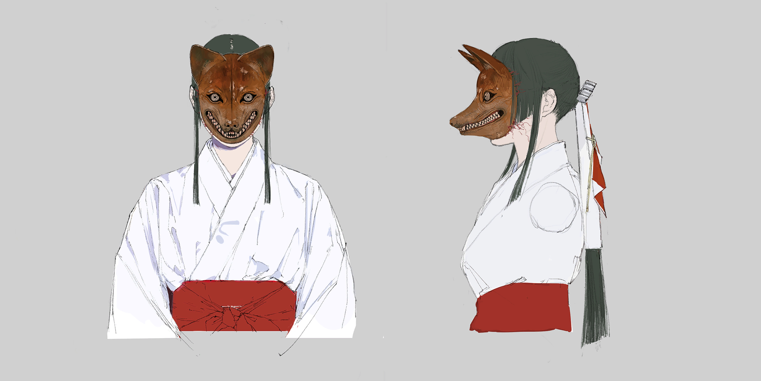 We also see the shrine maidens assisting with the Three Rituals deep in the Dark Shrine, they bring the ritual items like the saw and press the burning brand into Hinako’s back. They’re faceless and nameless, but integral to the ritual of the horrific events which take place there. They are only seen once, more to bring the happy couple sacred tamagushi (玉串) to be offered to the Nine-tailed Kitsune’s biggest altar.