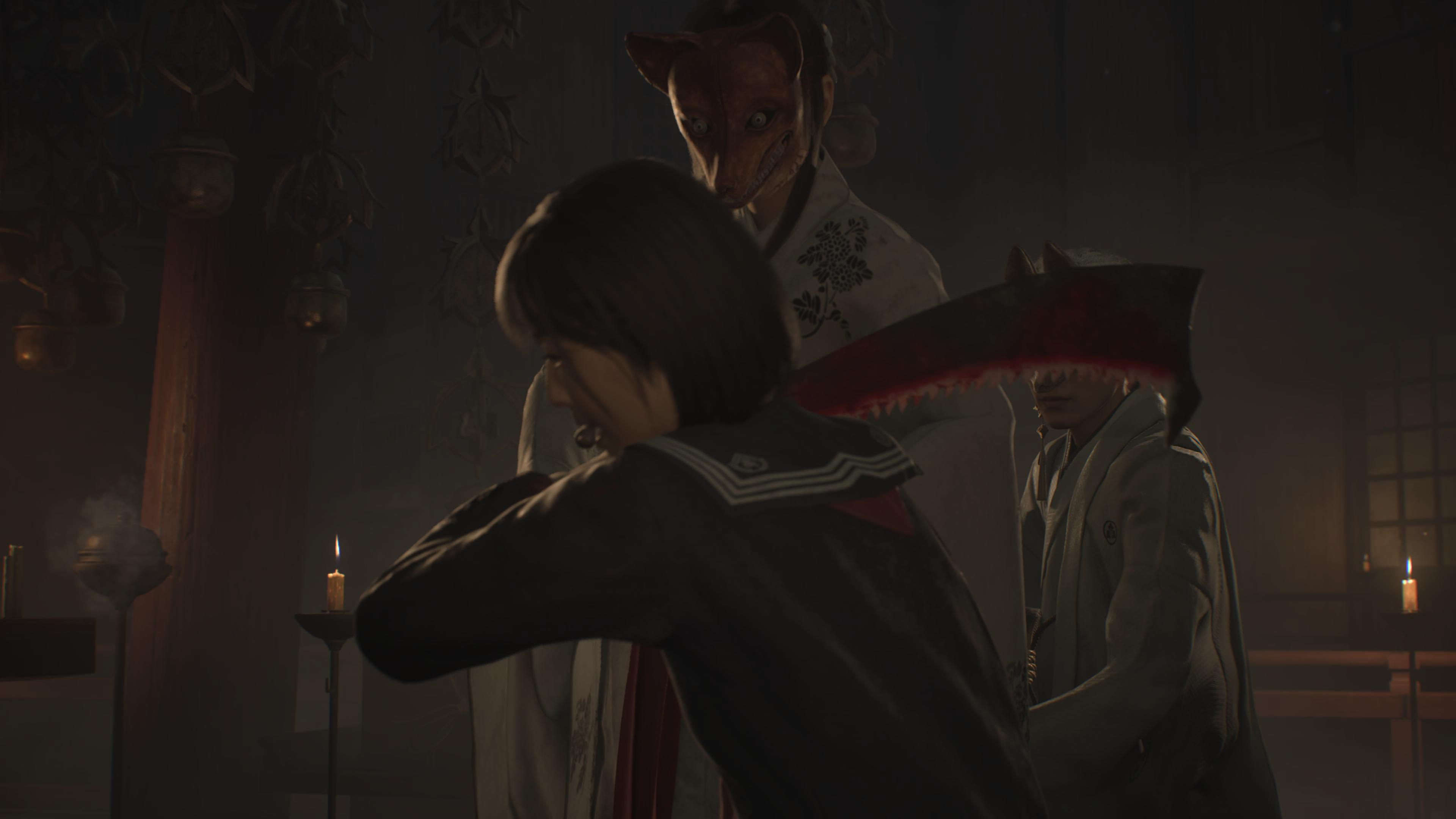 Hinako must saw off her own arm… Yeah. It’s visceral and gross, and just , well, absolutely horrific. Especially when you see how meek and almost drowsy Hinako is, convinced perhaps, this is just a dream. And then, yes, full on body horror. Even more so when the priestesses (shrine maidens wearing stylised fox masks) reveal an oversized Fox arm covered in fur which is then used as a replacement.